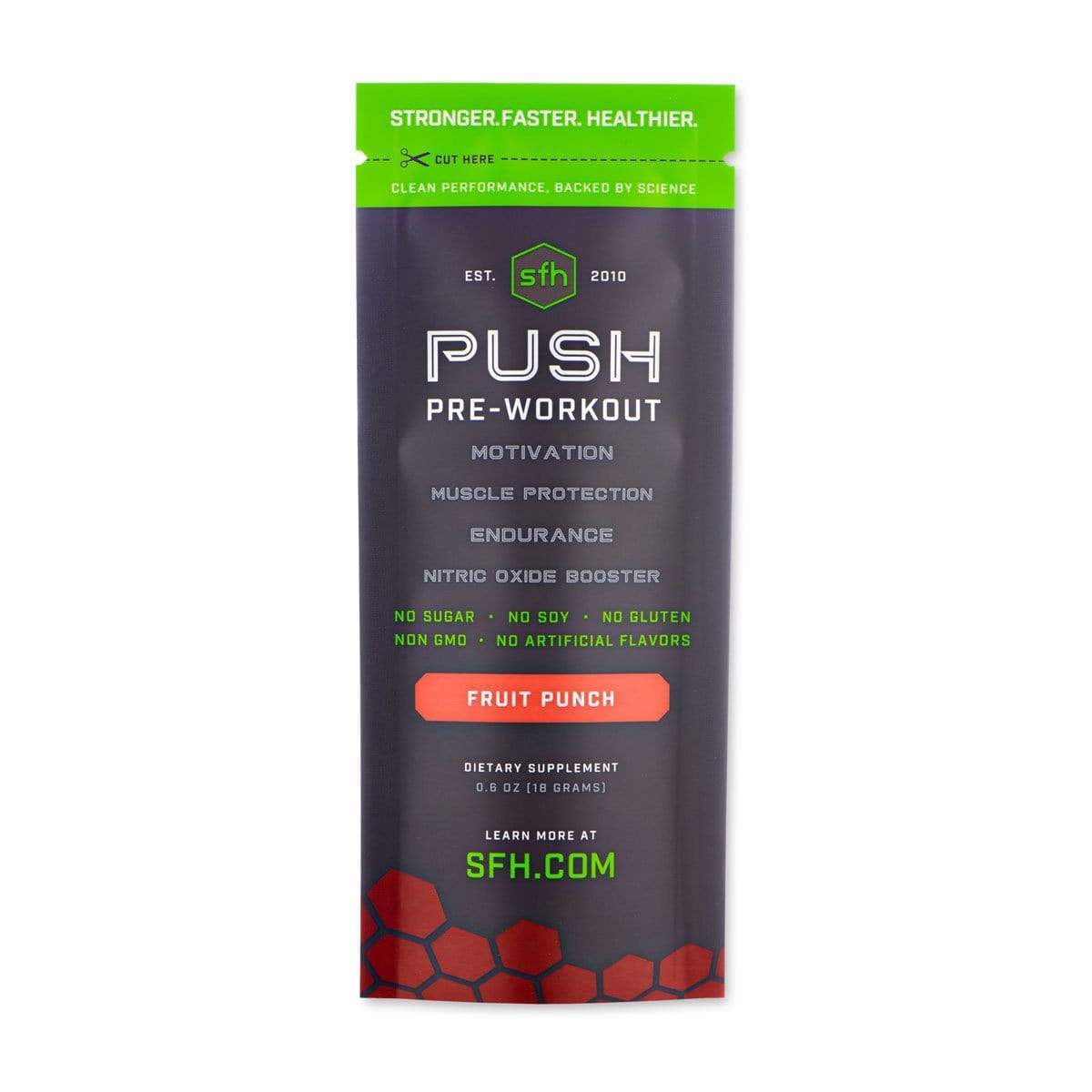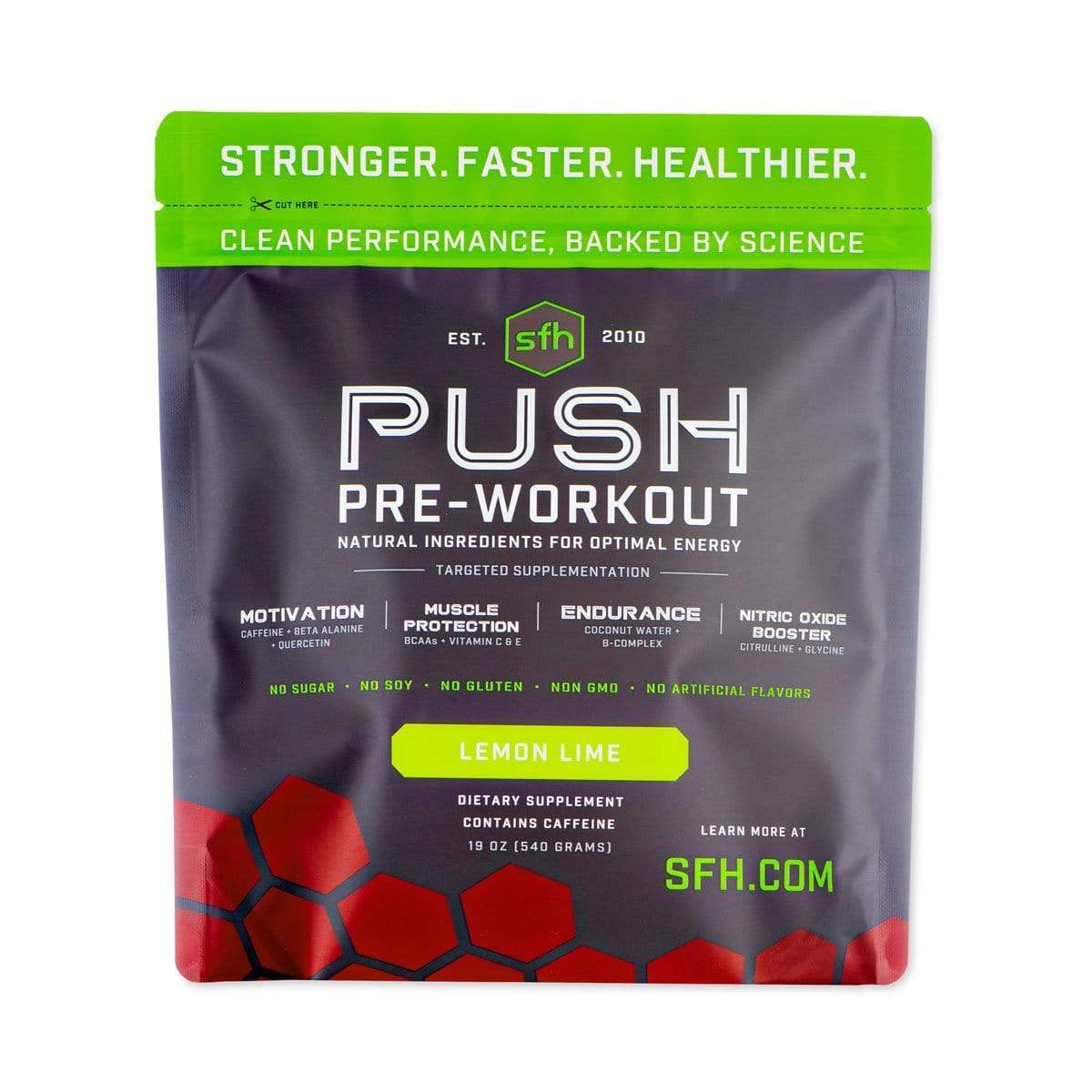 SFH Push is a pre-workout product that can help stimulate drive and focus so that you can get the most out of your workouts.SFH Push is loaded with ingredients that each serve a specific purpose. Caffeine (115 mg per serving) is added to give you an immediate boost, quercetin to combat inflammation and enhance performance, glycine to prevents fatigue and break down fat, as well as arginine to increase blood flow and oxygenation.